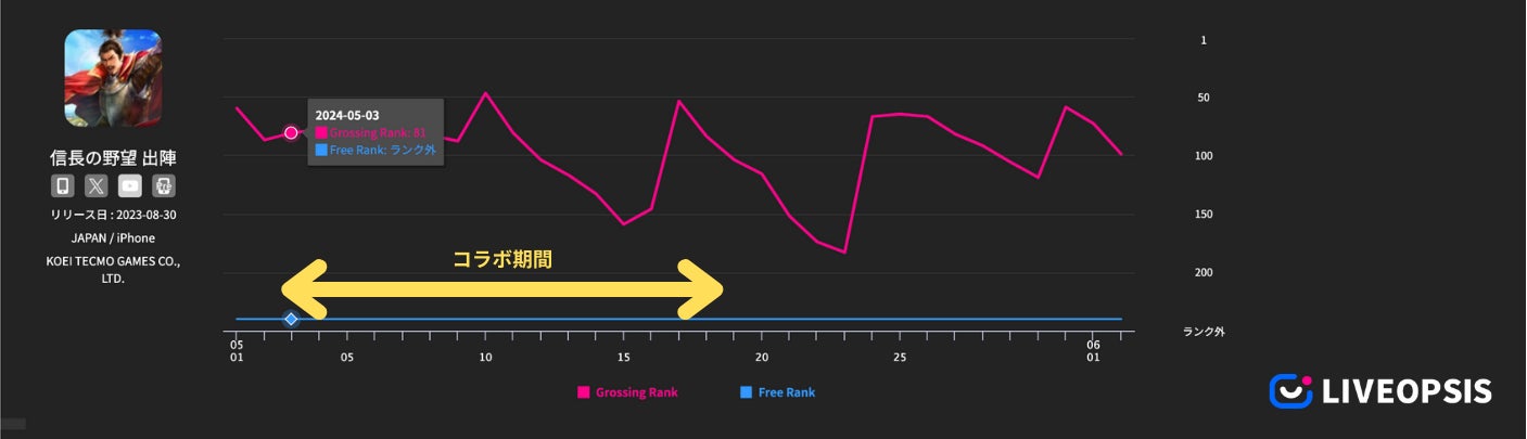 ランキングに影響はなかったものの、『信長の野望 出陣』は全国各地とコラボをおこなっている。位置情報/GPS機能を用いたコンテンツをアプリ内で用意することで、コラボ先側も集客イメージがつきやすく、コラボ成立の後押しになったと考えられ、地方コラボを定着化できたケースと言える。