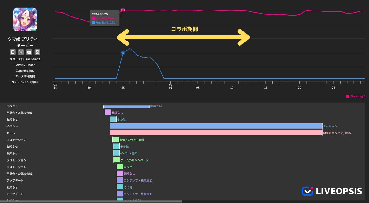 スマホゲームの「コラボ調査」は、スパイスマートで運営するLIVEOPSISでデータ取得しているヒットタイトル(※)を対象として、毎年定期的におこなっている。