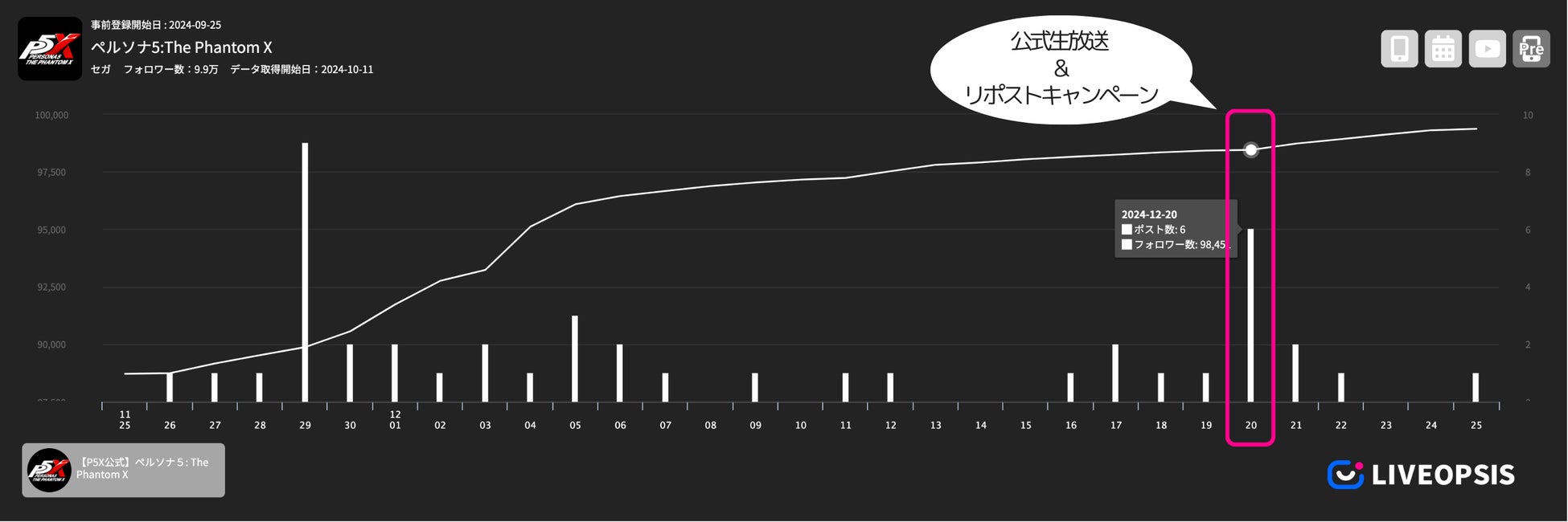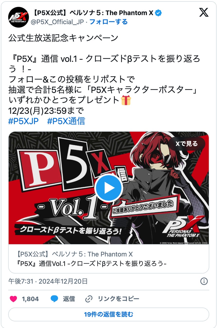 12月20日に配信された、クローズドβテストのアンケート結果や開発/運営メンバーより今後の計画などを発表する公式生放送ライブ「『P5X』通信 vol.1 – クローズドβテストを振り返ろう !」のリポストキャンペーンを実施していました。公式生放送ライブは調査した12/25時点で8.1万視聴されていました。