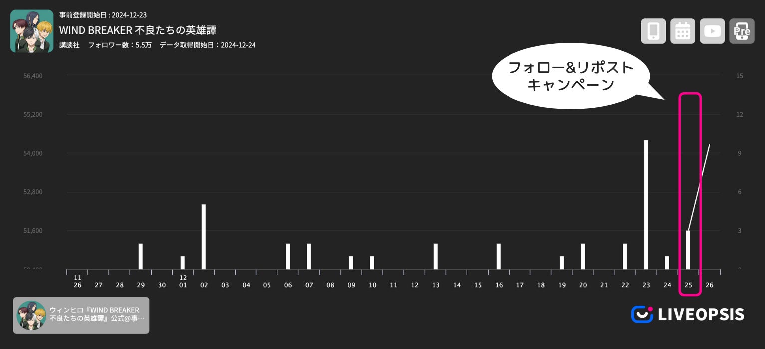 Amazonギフト券をプレゼントするキャンペーンはフォロワー数に大きなインパクトを与えるフォロワーブースト施策の代表格であると同時に、本作のIP人気が特に注目されたことがうかがえます。
