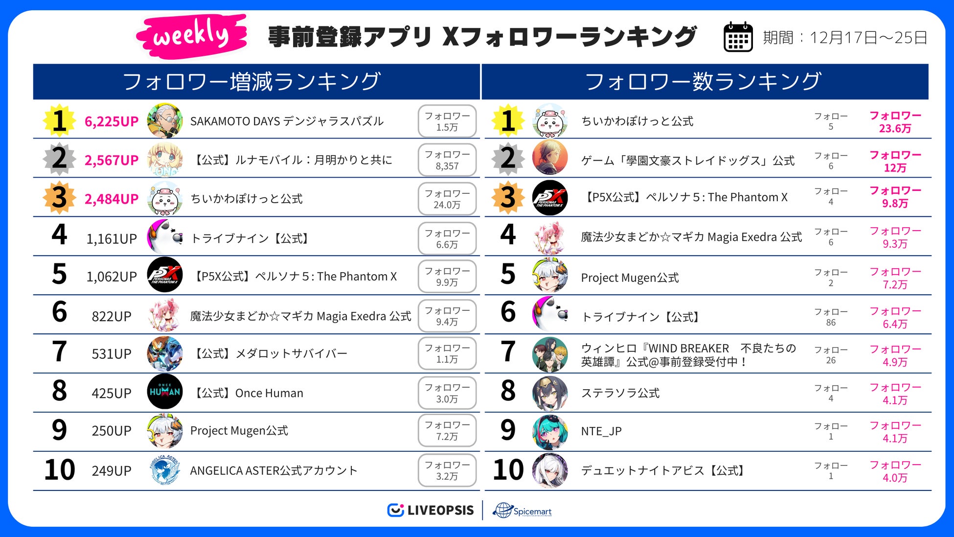 Weeklyフォロワーランキング(事前登録アプリのみ)[12月17日~25日]