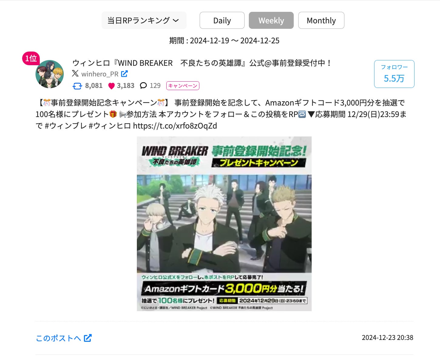 また、フォロワー数ランキングに目を向けてみると、12月23日に事前登録を開始したばかりの『WIND BREAKER 不良たちの英雄譚』が事前登録受付中アプリの中でTOP7にランクイン。事前登録開始を記念し、抽選でAmazonギフトコードをプレゼントするリポストキャンペーンで初速の勢いを加速させています。