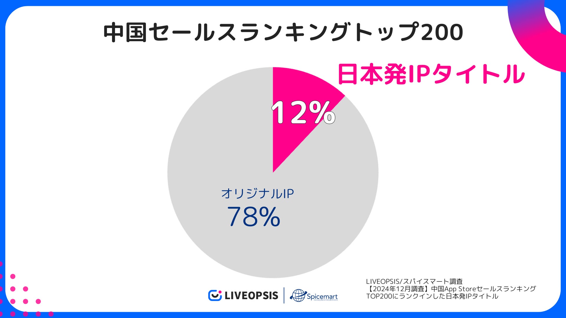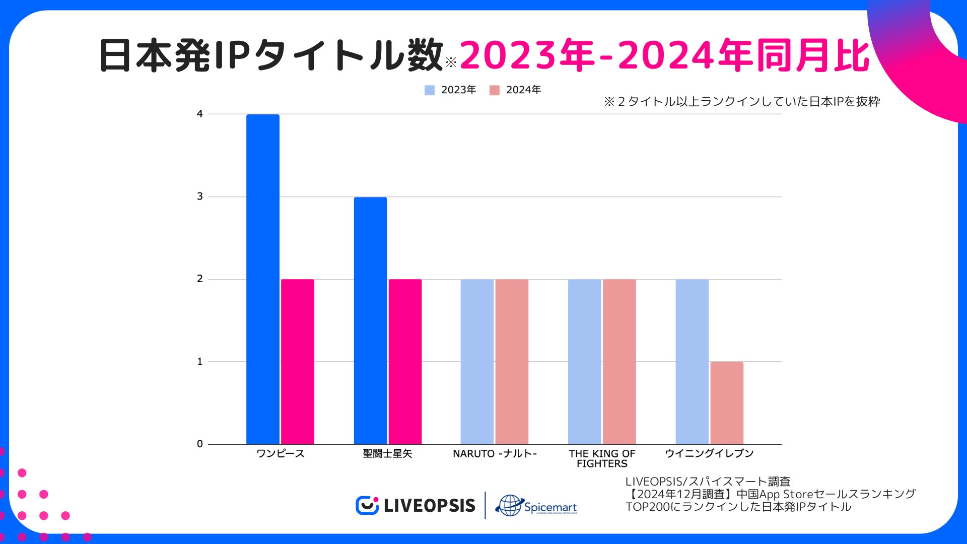 株式会社スパイスマートは、2024年12月における中国スマホゲーム市場における日本発IPタイトルの動向を調査しました。