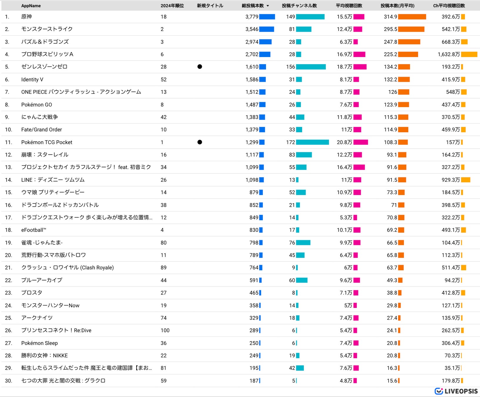 『Pokémon TCG Pocket』と『ゼンレスゾーンゼロ』のリリースが話題を牽引、投稿本数・視聴回数ともに爆発的増加
