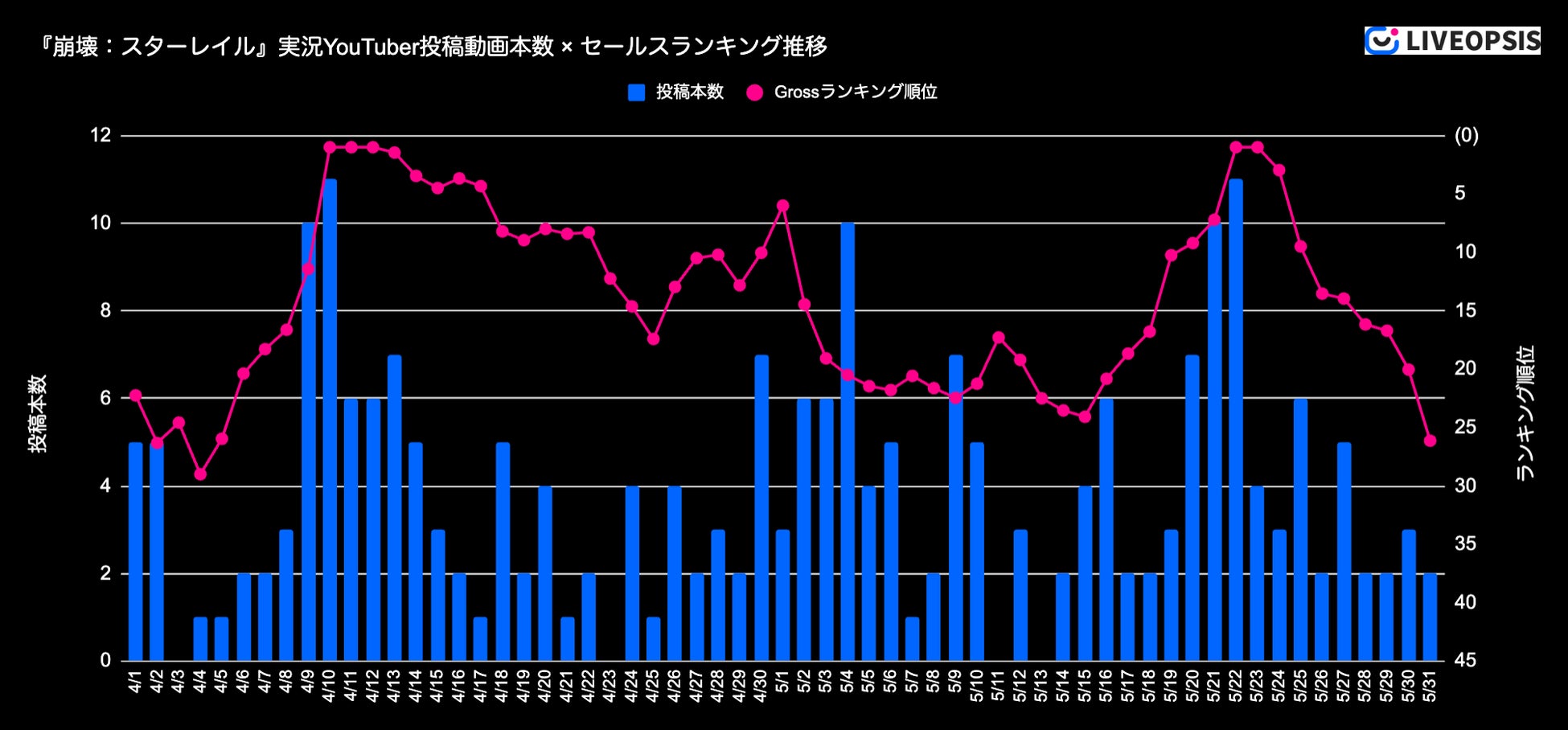 『崩壊:スターレイル』は、5月に動画投稿本数が先月より20本増加し15位と3つ順位を上げました。要因として5月21日のアップデートに伴い投稿本数の増加が見られます。投稿動画の中には、特に新しく追加された新星5キャラクター「ヒアンシー」に関する動画が19本と数が多く目立ちました。それに伴い本作は22日にセールスランキングで首位に浮上。実況YouTuberを中心に盛り上がったイベントは、ランキングにも大きく影響していることがわかります。