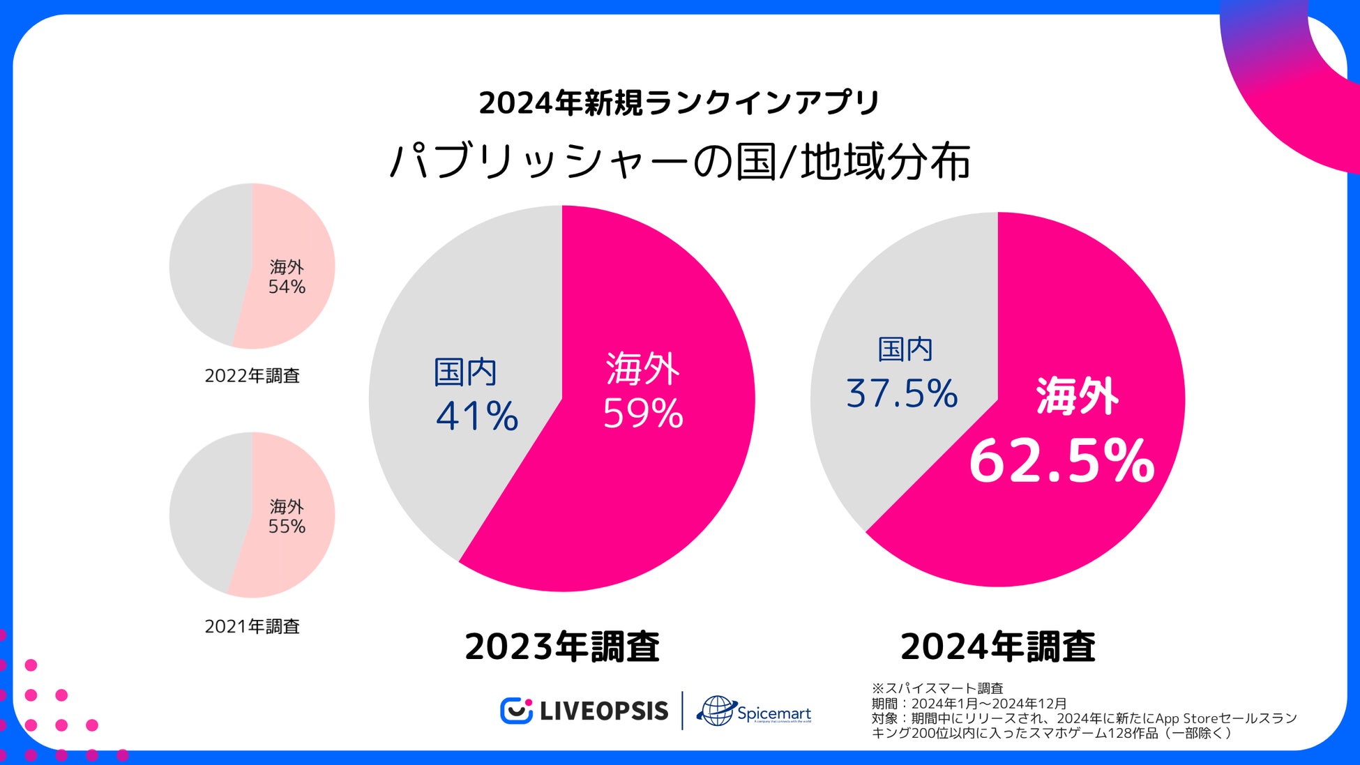 スパイスマートが今年1月に行った調査:2024年の年間平均セールスランキングTOP100においても海外発タイトルは53本とこちらも調査開始以来初めて過半数超えとなっており、新規ランクインアプリでも同様の傾向が見られます。