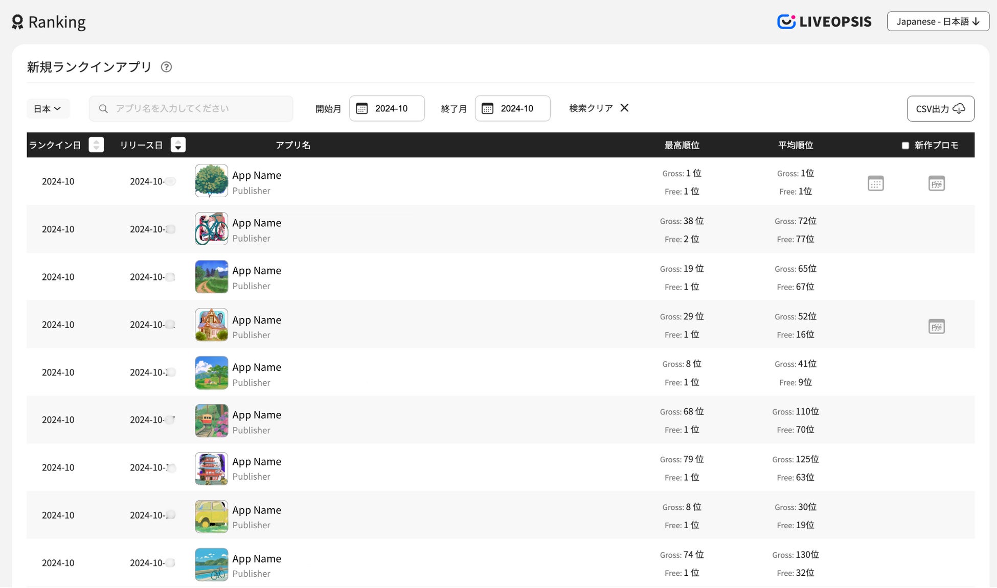 この機能では、App Storeのセールスランキング200位以内に入ったアプリが月ごとに表示され、注目の新作を最高・平均順位と合わせて把握することができます。